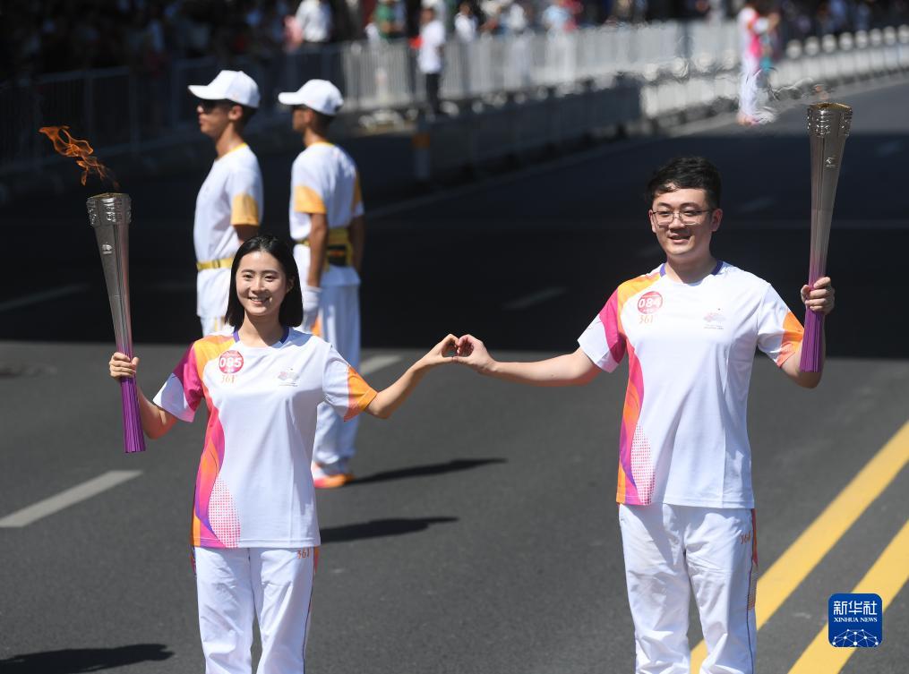 9月15日,火炬手王子震(右)和项珍珍在火炬传递中。
