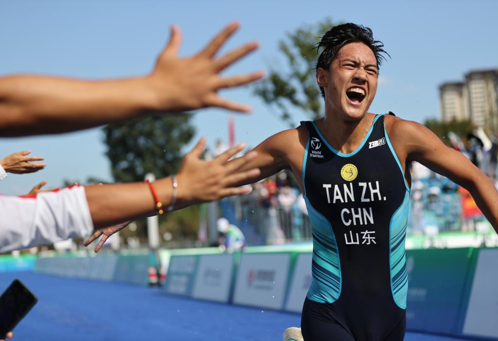 山东队选手谭钊在十四运会铁人三项混合团体接力决赛冲刺前击掌庆祝
