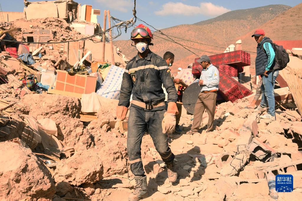 9月14日,救援人员在位于摩洛哥豪兹省的伊姆利勒村的地震废墟上搜救。