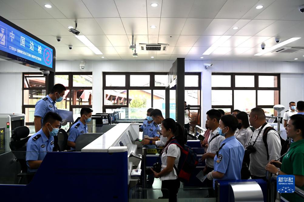 9月15日,在中越德天(板约)瀑布跨境旅游合作区,中国游客排队通关出境。新华社记者 曹祎铭 摄