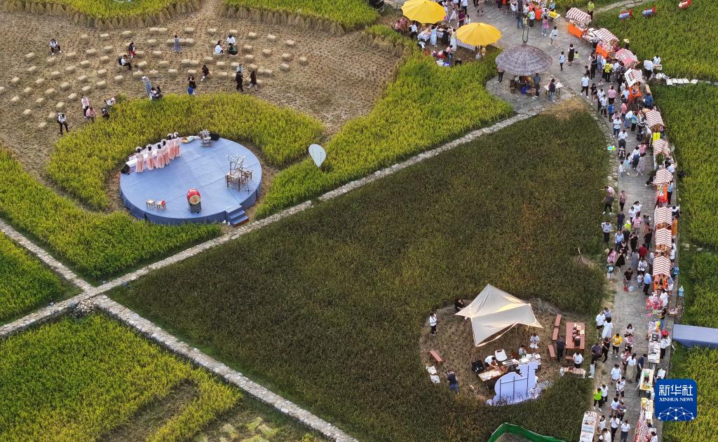当日,湖南省张家界市武陵源区黄龙洞景区举办“田园市集庆秋收”活动。金黄的稻田旁,游人可欣赏民俗文化节目,还可品尝特色小吃、购买当地特色农产品和手工艺品,感受丰收的喜悦。