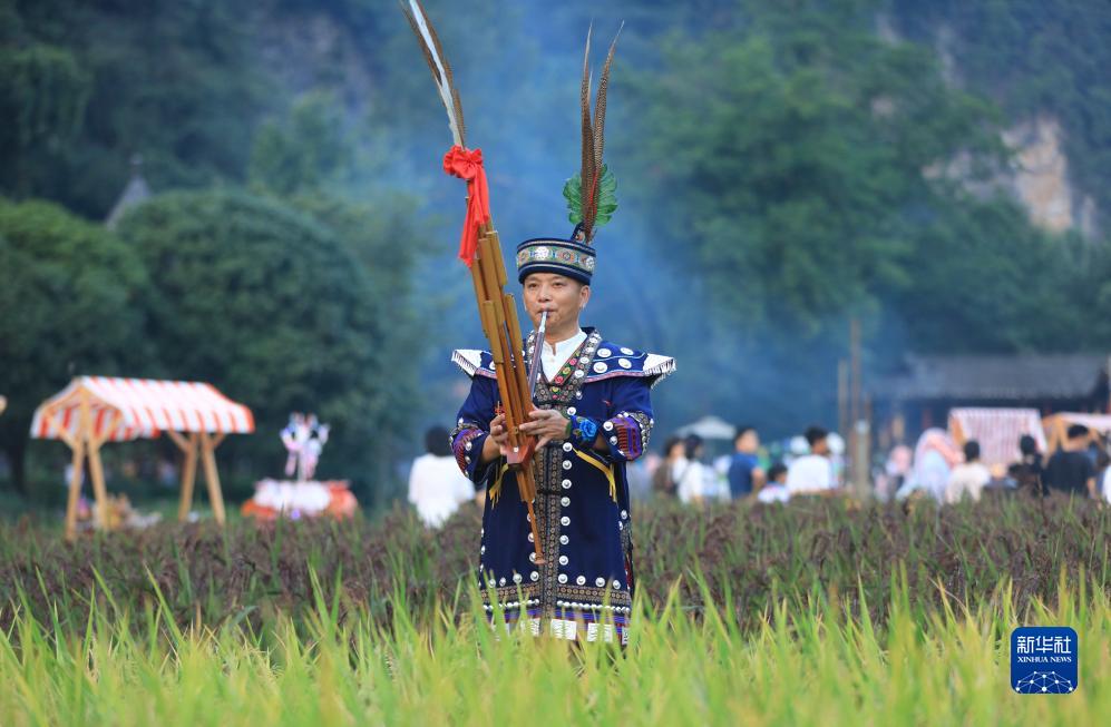 9月15日,民间艺人在张家界市武陵源区黄龙洞景区“田园市集庆秋收”活动现场表演。