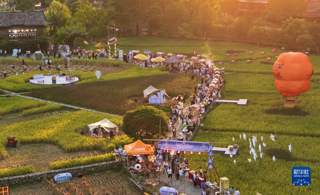 当日,湖南省张家界市武陵源区黄龙洞景区举办“田园市集庆秋收”活动。金黄的稻田旁,游人可欣赏民俗文化节目,还可品尝特色小吃、购买当地特色农产品和手工艺品,感受丰收的喜悦。