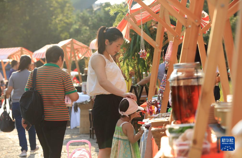 9月15日,游客在张家界市武陵源区黄龙洞景区“田园市集庆秋收”活动中挑选手工艺品。