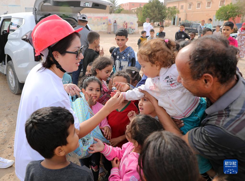 9月14日,在摩洛哥塔鲁丹特路边一处村庄,摩洛哥华人商会成员向当地儿童分发糖果。新华社记者 王东震 摄