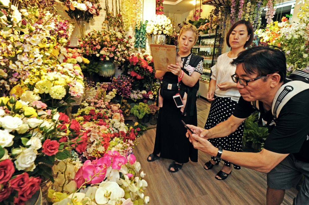 ↑日本客商田口喜启(右)在浙江义乌国际商贸城拍摄仿真花样品。