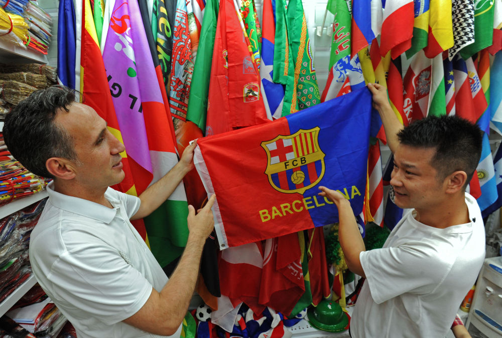 ↑马其顿球迷阿夫尼在浙江义乌国际商贸城体育用品市场采购巴塞罗那足球队挂旗。
