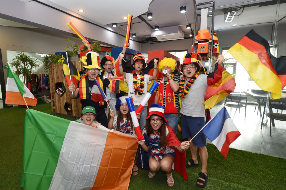 ↑浙江义乌一家外贸公司的员工集体展示为欧洲客户设计的各式球迷用品。