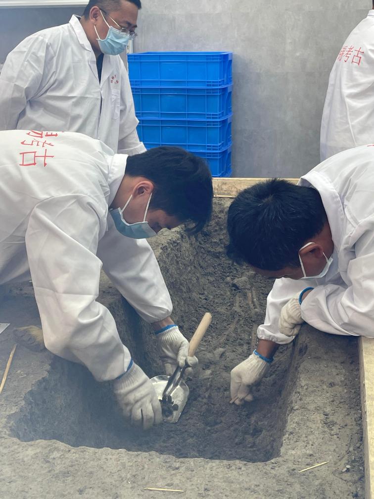 今年6月2日,考古工作者对打包提取并转运至中国社会科学院考古研究所华东基地“探源科考舱”内的一座马鞍遗址墓葬进行发掘。新华社记者朱国亮 摄