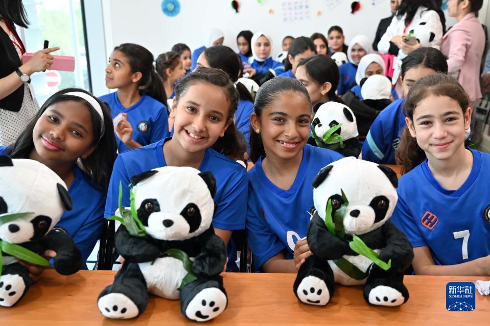 9月17日,在科威特哈瓦利省的科威特中国文化中心,体验学习汉语的孩子们与熊猫玩具合影。新华社发(阿萨德 摄)