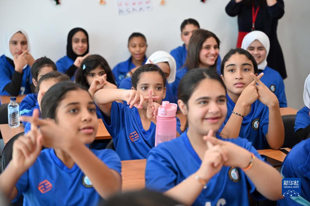 9月17日,孩子们在科威特哈瓦利省的科威特中国文化中心体验学习汉语。新华社发(阿萨德 摄)