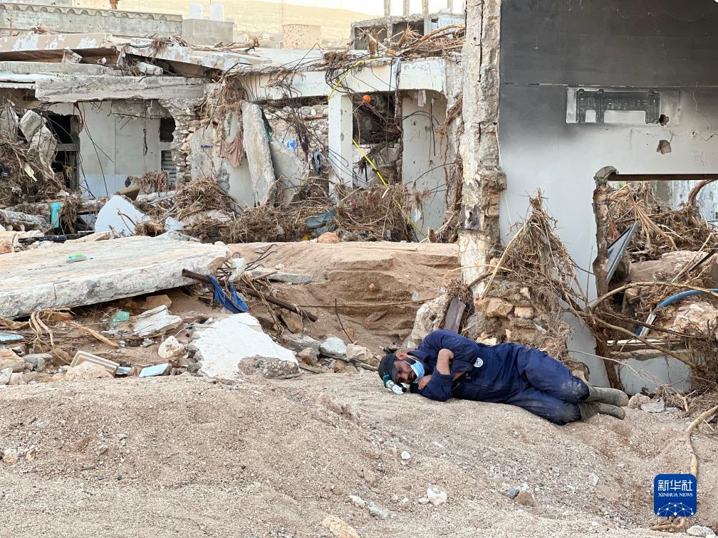 9月17日,一名救援人员躺在利比亚德尔纳的建筑物废墟上休息。