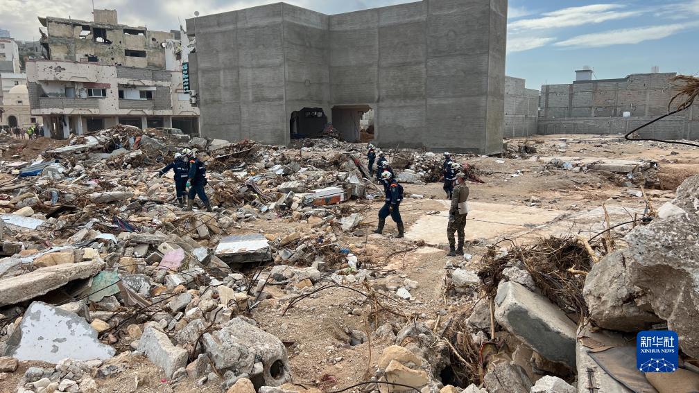 9月17日,国际救援人员在利比亚德尔纳的建筑废墟上工作。