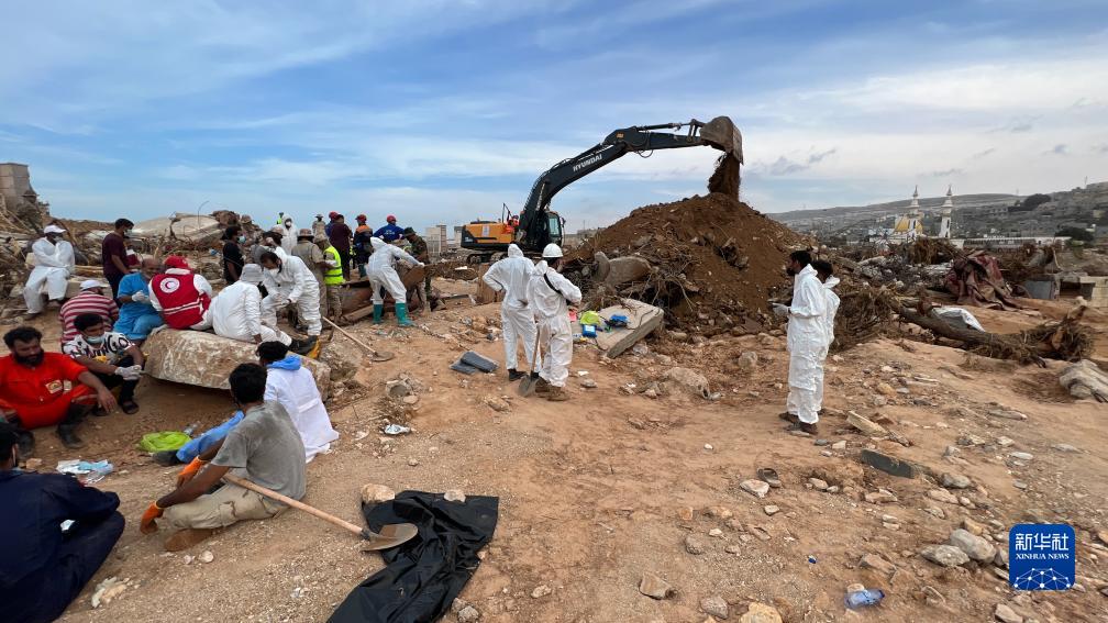 9月17日,救援人员在利比亚德尔纳的受灾地区工作。