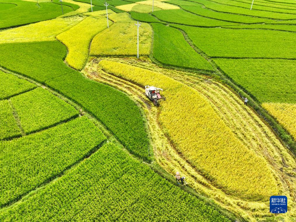 9月16日,湖南省郴州市桂阳县流峰镇农民驾驶收割机在收割水稻(无人机照片)。