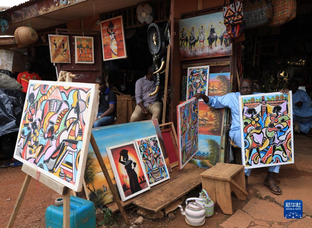 9月16日,在喀麦隆首都雅温得手工艺品市场,商贩在售卖绘画作品。