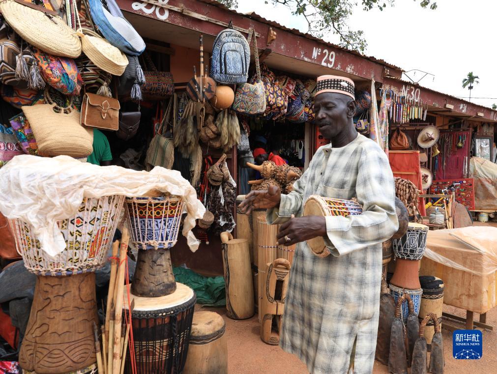 9月16日,在喀麦隆首都雅温得手工艺品市场,一名商贩在推销手鼓。