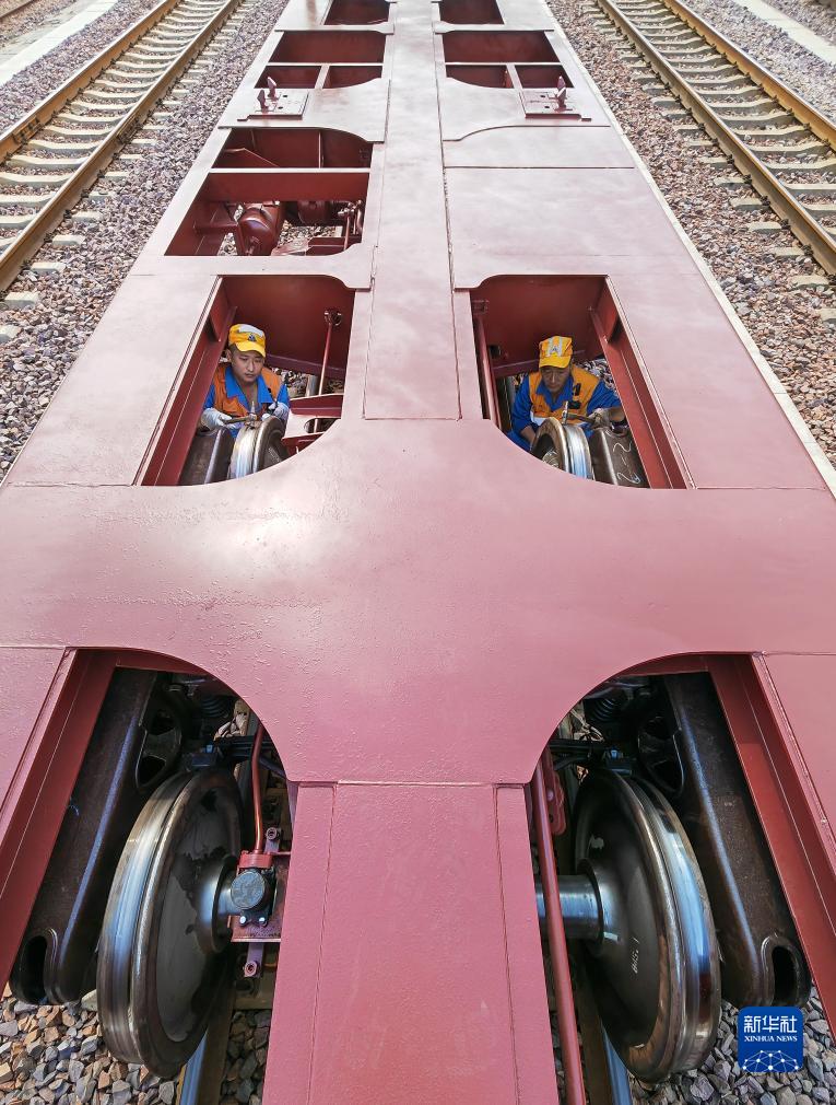 9月17日,在郑州北站编组场,中欧班列(郑州)整备班组的货车检车员在检查车辆轮对技术状态。
