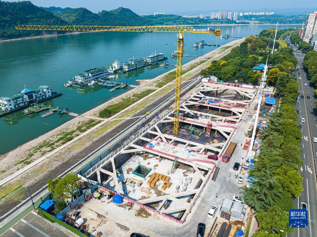 9月17日,三峡集团旗下长江环保集团建设者在宜昌市“一江两岸”污水厂网新建、改扩建项目大公桥调蓄池施工现场加紧建设(无人机照片)。