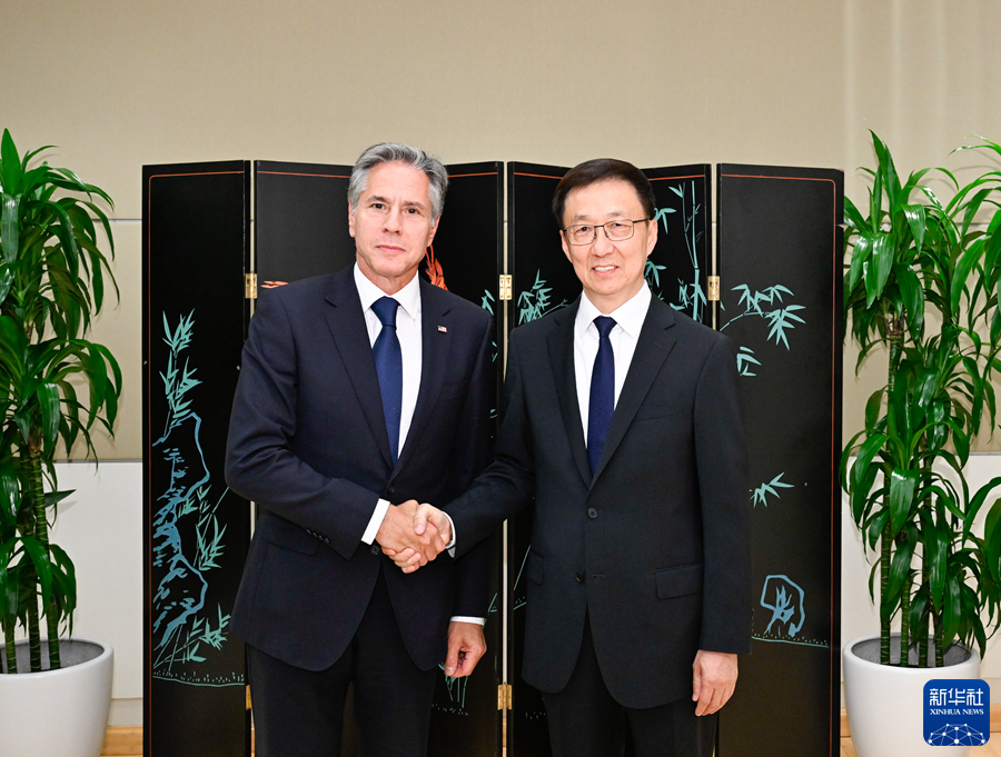当地时间9月18日,国家副主席韩正在纽约出席联合国大会期间会见美国国务卿布林肯。 新华社记者 申宏 摄
