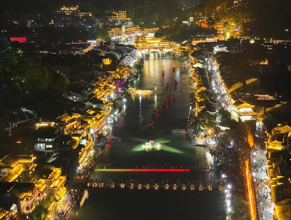 图为8月25日拍摄的凤凰古城沱江夜景(无人机照片)。新华社记者赵众志 摄