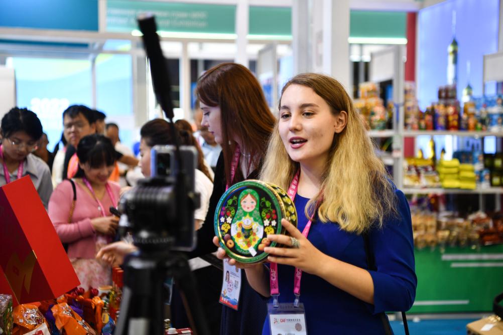 9月19日,外国参展商在杨凌农高会展台进行直播。新华社记者 张博文 摄