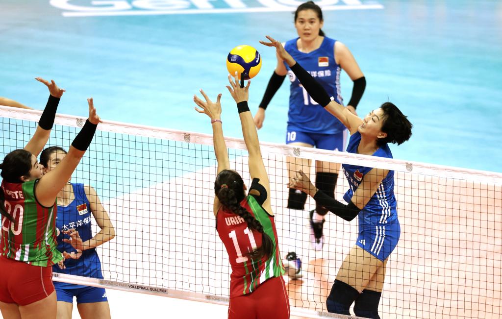 9月17日,中国队球员袁心玥(右一)在比赛中扣球。当日,在浙江省宁波市举行的巴黎奥运会女排资格赛A组比赛中,中国队以3:0战胜墨西哥队。新华社记者 陈斌 摄