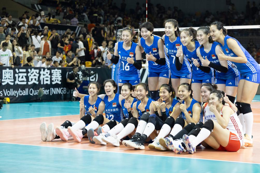 9月17日,中国队球员在赛后合影。当日,在浙江省宁波市举行的巴黎奥运会女排资格赛A组比赛中,中国队以3:0战胜墨西哥队。新华社记者 张涛 摄