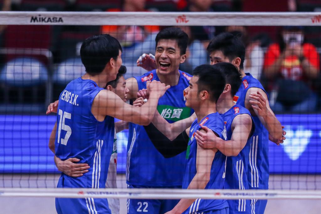 7月9日,中国队球员在比赛中庆祝得分。当日,在菲律宾帕赛举行的2023年世界男排联赛菲律宾站比赛中,中国队以1:3不敌加拿大队。新华社发(乌马利摄)
