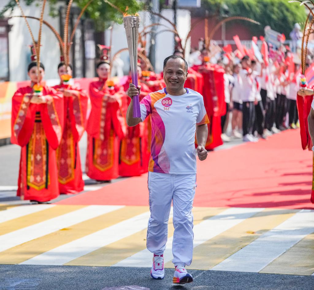 9月19日,火炬手孔令立在火炬传递中。新华社记者 孙非 摄
