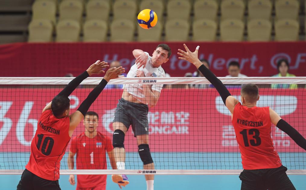 9月19日,哈萨克斯坦队球员昆琴科(上)在浙江省绍兴市举行的杭州亚运会男排小组赛A组比赛中扣球。最终,哈萨克斯坦队以3:2战胜吉尔吉斯斯坦队。新华社记者 翁忻旸 摄