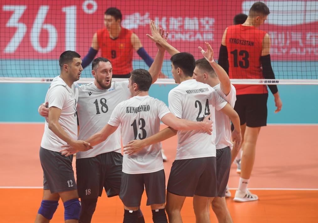 9月19日,哈萨克斯坦队球员在浙江省绍兴市举行的杭州亚运会男排小组赛A组比赛中庆祝得分。最终,哈萨克斯坦队以3:2战胜吉尔吉斯斯坦队。新华社记者 翁忻旸 摄