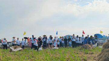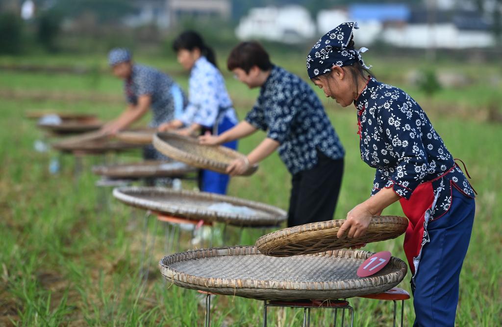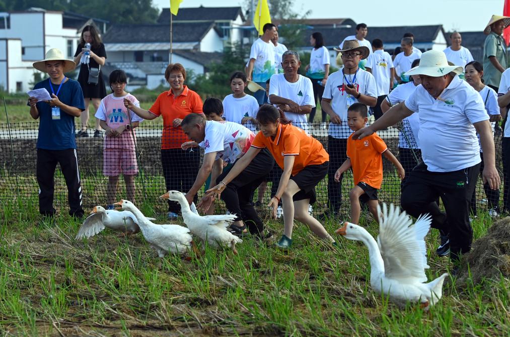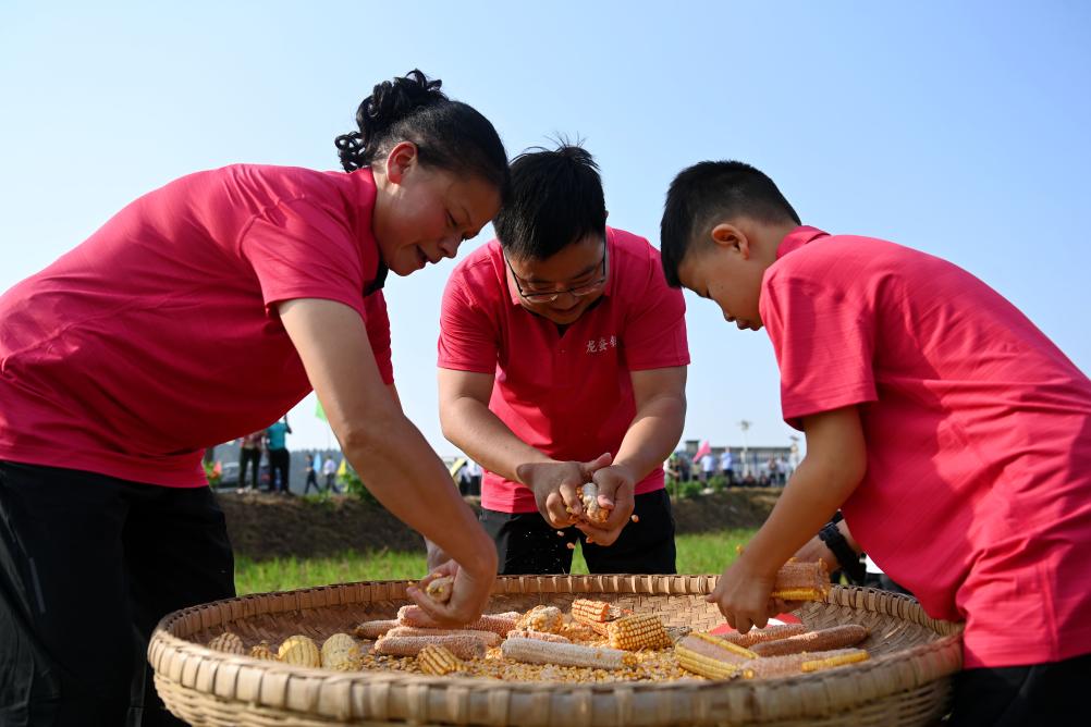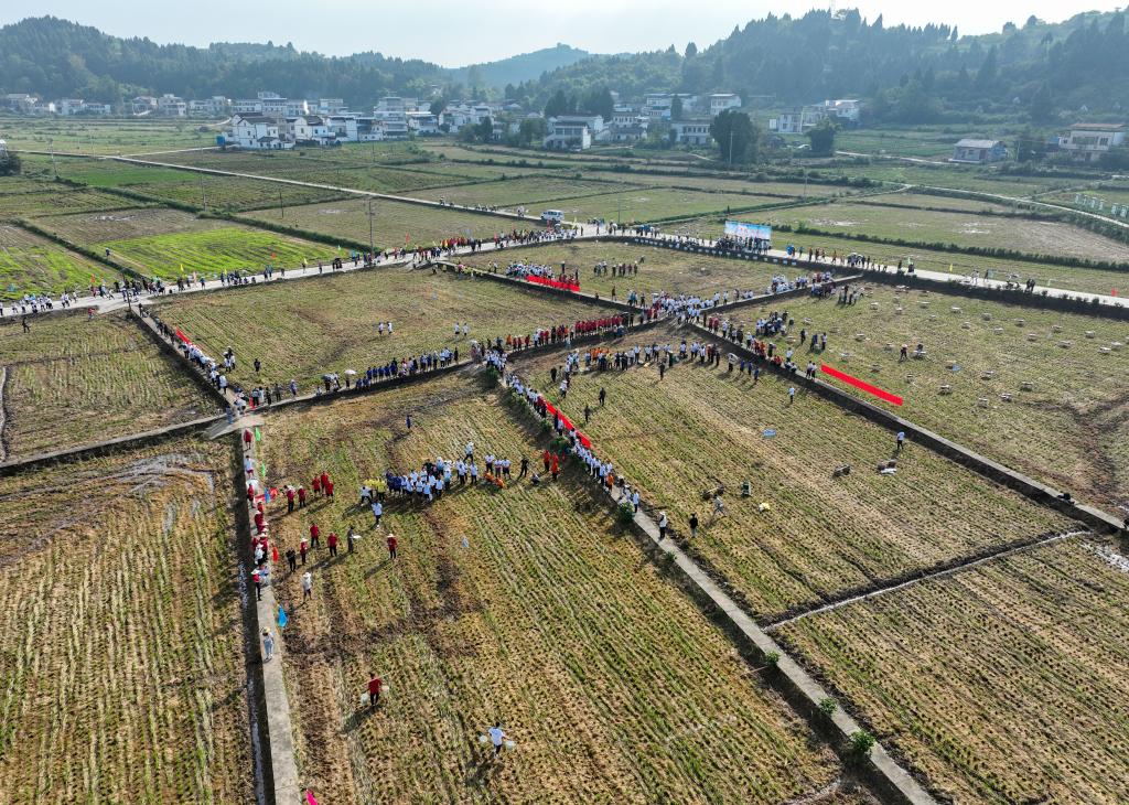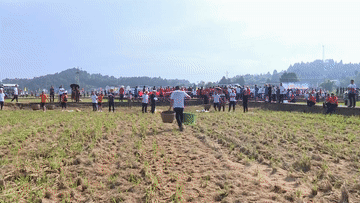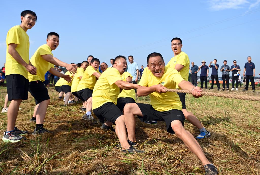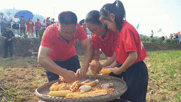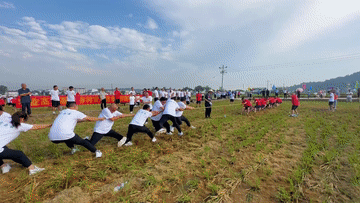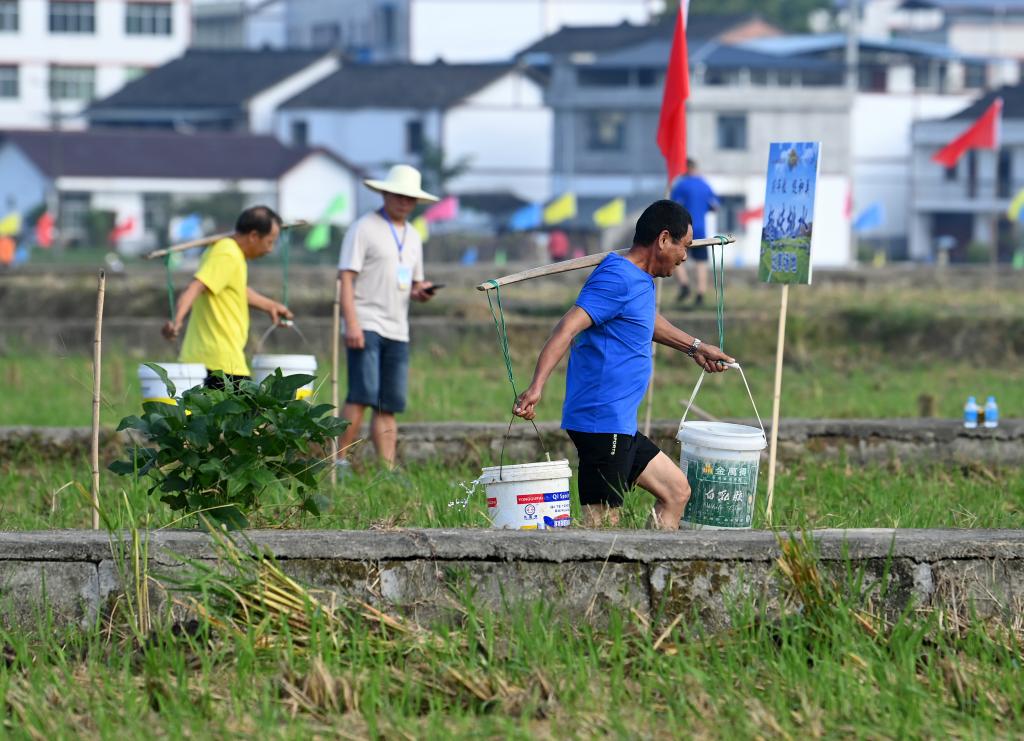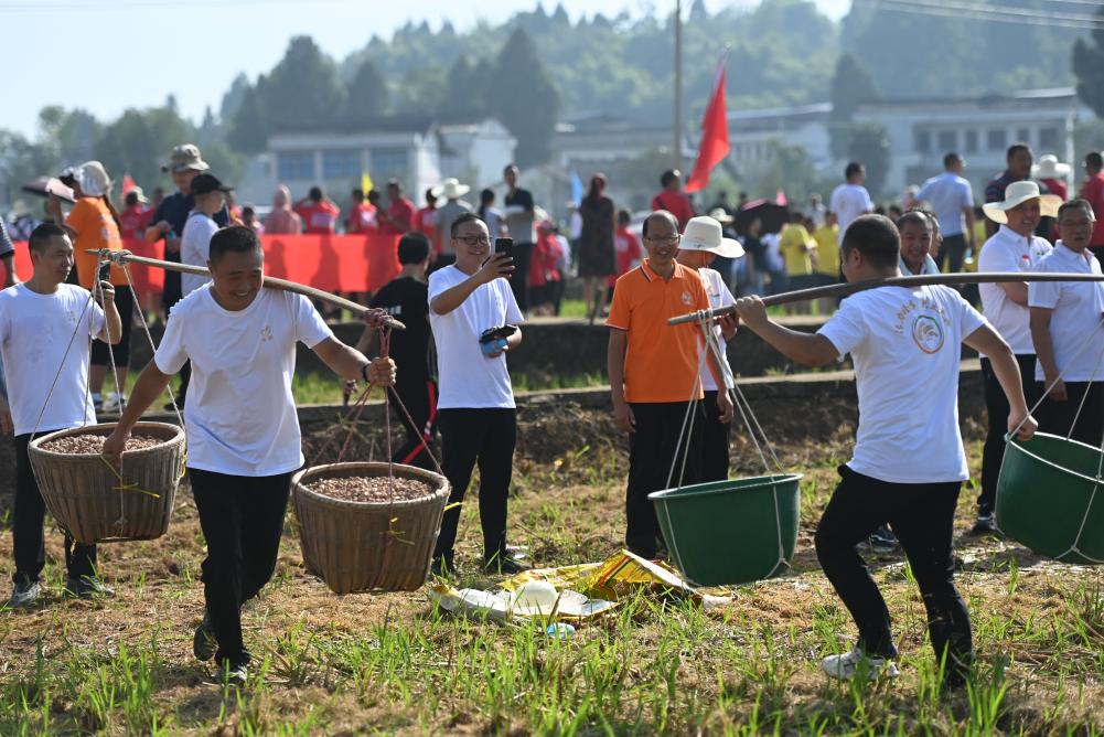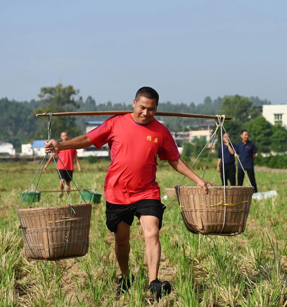 各参赛队队员肩挑一担30公斤粮食进行接力