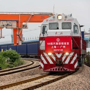 9月20日,上海发往广州的载有40个50英尺集装箱的X8721次多联快车从铁路上海货运中心闵行站出发,驶往广东东莞。新华社记者 王翔 摄