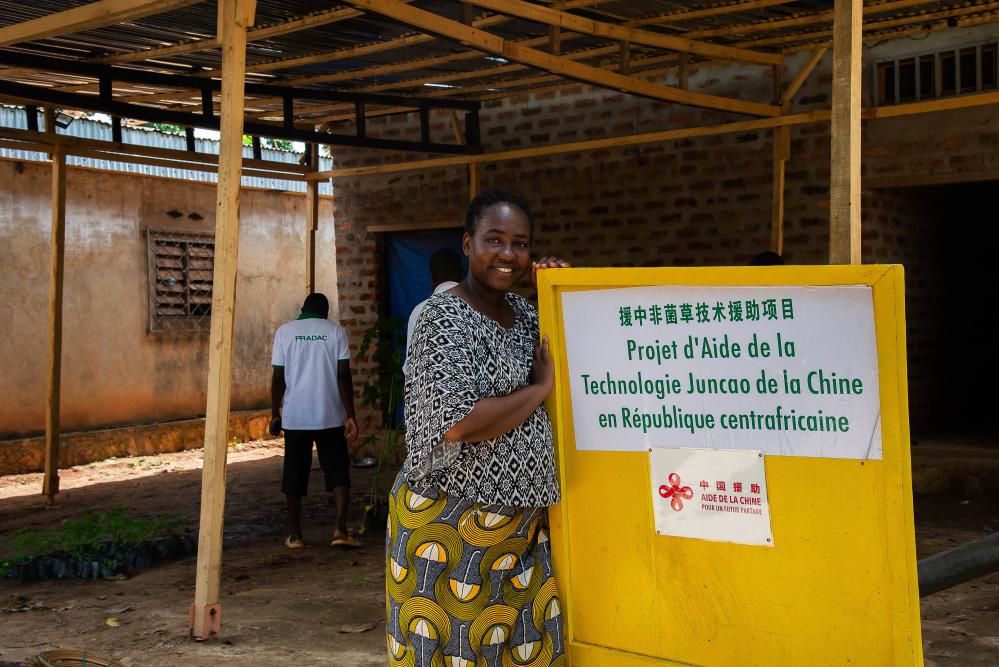 2022年5月31日,在中非共和国首都班吉郊区,一名当地妇女站在中国援中非菌草技术项目展板旁。(新华社记者罗毓摄)