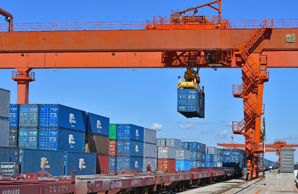 9月19日,在中欧班列(沈阳)集结中心,中国铁路沈阳局集团有限公司工作人员进行中欧班列装车作业。新华社记者 杨青摄