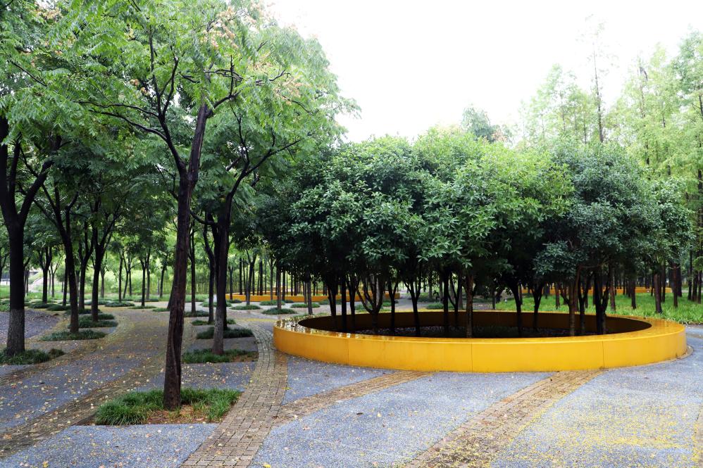 作为浙江省风貌办推介的“迎亚运”城乡风貌典型案例之一,燕尾洲公园将河岸改造为多级可淹没的梯田种植带,打造城市中的自然田园风光,使滨江水岸成为兼具生态保育、游人休憩和防洪功能的美丽景观,园内活动场所采用大面积透水铺装,泡状雨水收集池散布在林间,助力海绵城市建设。
