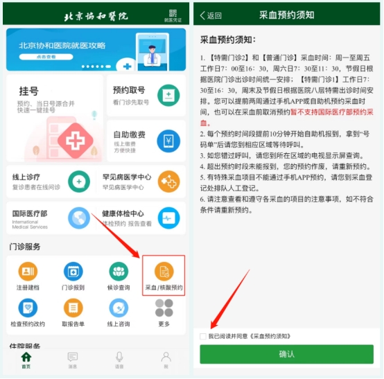 (1)协和App预约:打开协和App,在门诊服务栏选择采血预约,仔细阅读采血须知,勾选并点击确认。选择就诊人,点击查询,根据提示预约采血时间。