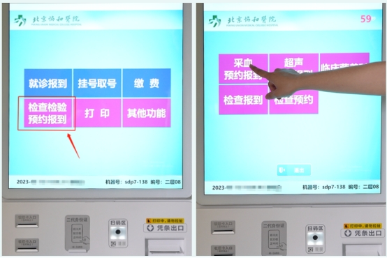 (1)到任意自助机处报到,依次点击“检查检验预约报到”、“采血预约报到”,按照自助机提示进行操作,并打印回执单。