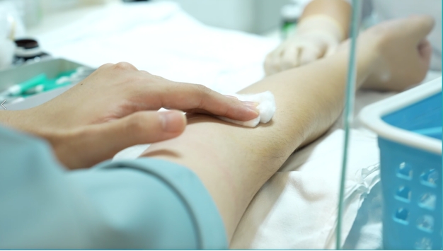 叫号后持采血回执单到相应窗口:递回执单核对身份,伸胳膊进行采血。