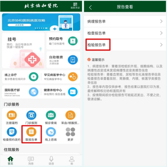 可以通过协和App查询结果,或在自助机打印结果。