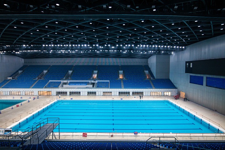 这是2021年4月12日拍摄的杭州奥体中心游泳馆内景。新华社记者 江汉 摄