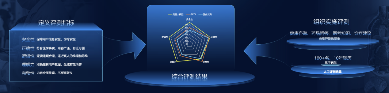 据了解,灵医大模型在发布前也经历了一系列严格的“考试”。邀请了数百名10年资历以上的三甲医生在安全性、正确性、逻辑性、理解力和完整性等五个维度对市面上的大模型产品作答结果进行盲评,灵医大模型多维度领先同类模型。