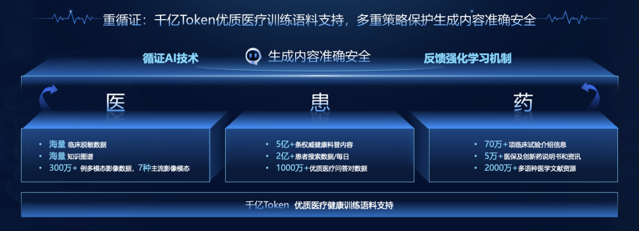 数据方面,灵医大模型致力于实现“循证AI赋能大健康产业”,确保医疗数据的准确性和可靠性。灵医大模型持续输入百度沉淀的覆盖“医-患-药”全场景的医疗健康数据和权威医学知识,包括线下诊疗场景的脱敏病历、文献指南、医疗知识图谱数据,线上场景的科普知识、健康医典、健康咨询数据,以及贯穿全生命周期的全球药品器械数据等。优质的训练语料,保证了大模型的回答有源可溯。