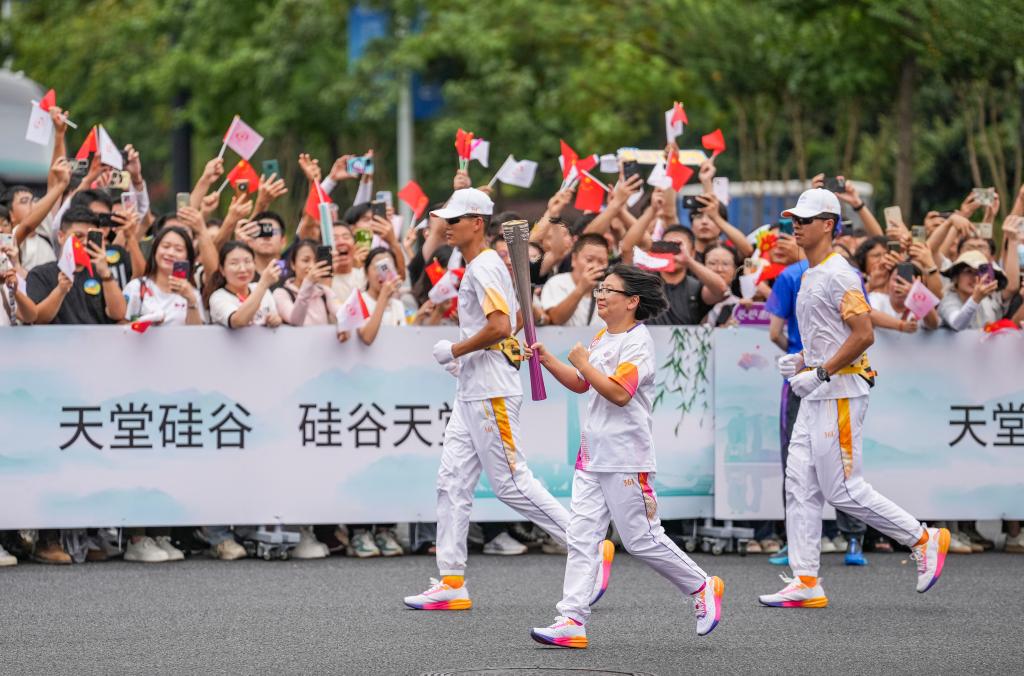 9月20日,火炬手黄赣英在火炬传递中。当日,杭州亚运会火炬传递仪式杭州站在浙江省杭州市举行,完成最后一站传递。新华社记者孙非摄