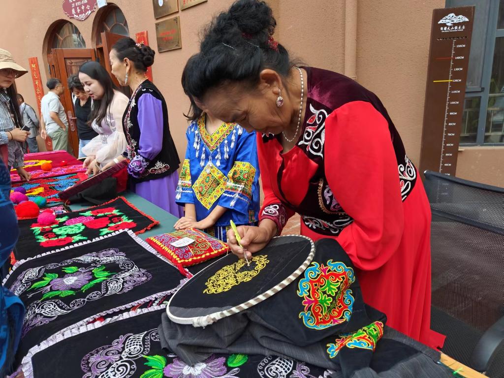 8月23日,一位柯尔克孜族绣娘在2023“新疆是个好地方”对口援疆19省市非物质文化遗产展期间刺绣。新华社记者 张瑜 摄