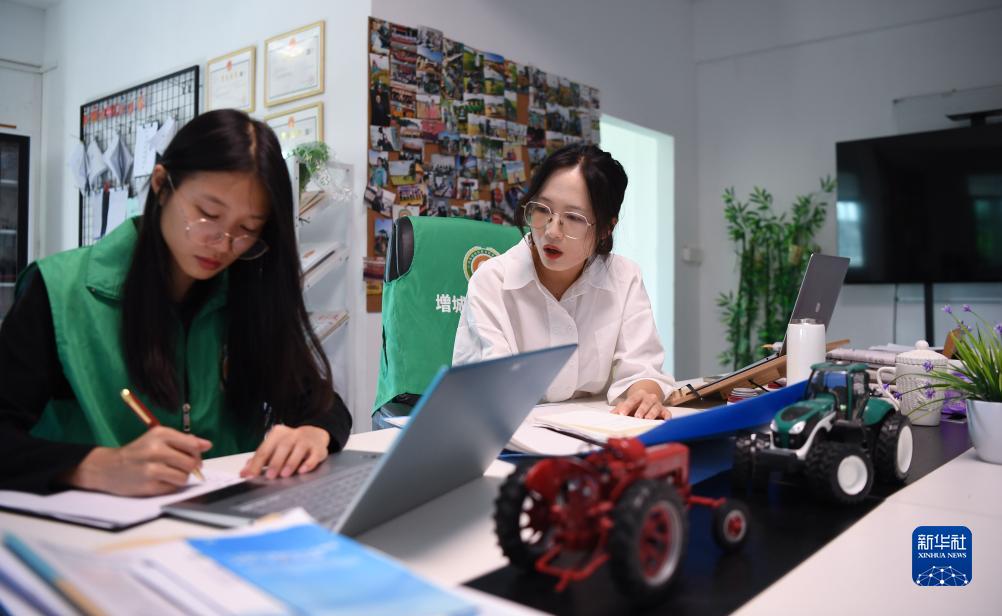 9月18日,在广州市增城区石滩镇石湖村的石乡农机专业合作社,沈燕芬(右)和沈笑芬在商量工作规划。