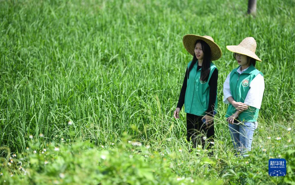 9月18日,在广州市增城区石滩镇石湖村一处农田,沈燕芬(右)和沈笑芬查看禾苗长势。