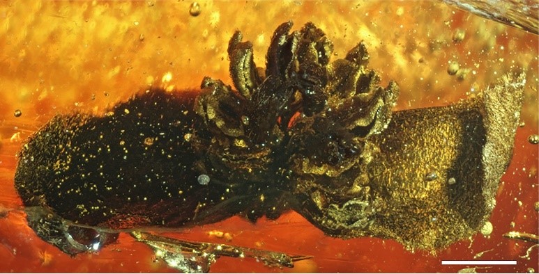 漳浦琥珀中的志炎银缕梅雄花,比例尺1mm。(中国科学院南京地质古生物研究所供图)