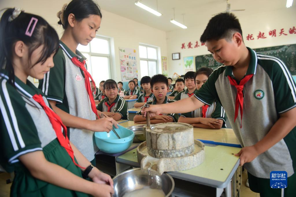 9月21日,沧州市新华区荣官屯小学的小学生在研磨豆浆。